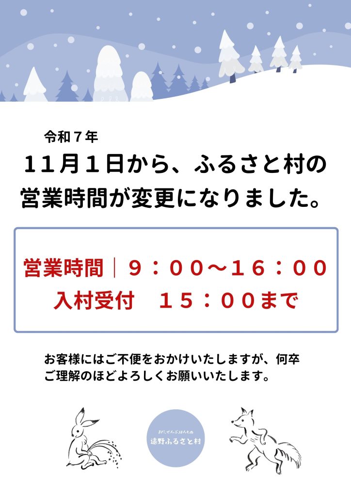 ホーム 施設紹介 季節の行事・楽しみ イベント・体験 団体・法人 お問い合わせ ホーム 施設紹介 季節の行事・楽しみ イベント・体験 団体・法人 お問い合わせ お知らせ ホーム > お知らせ 11/1(土)より営業時間が変更になります。 2025.10.30 2025年11/1(土)より営業時間が変更になります。 11/1(土)~2/28(土) 営業時間 9:00~16:00 入村受付 15:00まで 何卒よろしくお願い申し上げます。 < 前の記事へ